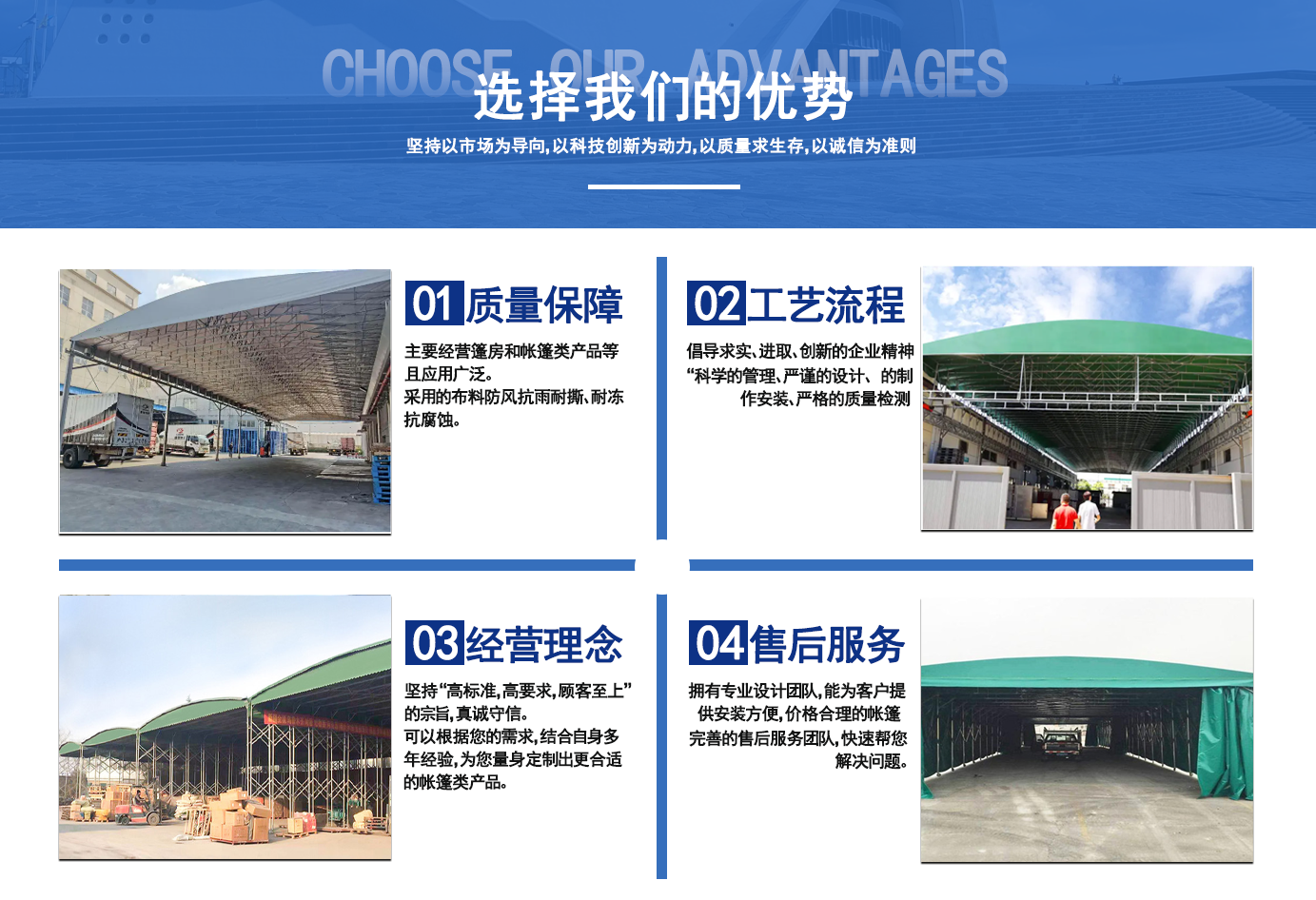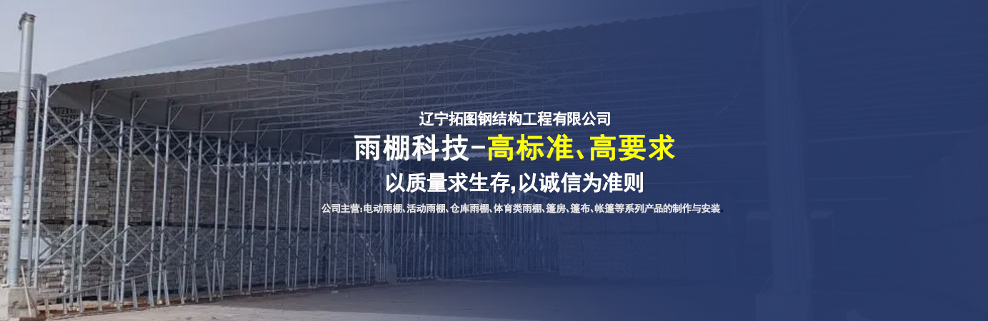 遼寧拓圖鋼結(jié)構(gòu)工程有限公司是一家專業(yè)從事推拉篷設(shè)計、制作、安裝、使用、維修的綜合性公司。公司主營:電動雨棚、活動雨棚、倉庫雨棚、體育類雨棚、篷房、篷布、帳篷等系列產(chǎn)品的制作與安裝。 遼寧拓圖鋼結(jié)構(gòu)工程有限公司堅持以市場為導(dǎo)向,以科技創(chuàng)新為動力,以質(zhì)量求生存,以誠信為準(zhǔn)則,倡導(dǎo)求實(shí)、進(jìn)取、創(chuàng)新的企業(yè)精神。“科學(xué)的管理、嚴(yán)謹(jǐn)?shù)脑O(shè)計、 的制作安裝、嚴(yán)格的質(zhì)量檢測、良好的后期服務(wù)成就企業(yè)的信譽(yù),為您提供優(yōu)質(zhì)服務(wù)。 遼寧拓圖鋼結(jié)構(gòu)工程有限公司傾力于開發(fā)應(yīng)用三維空間結(jié)構(gòu)與新材料的結(jié)合,將廣告藝術(shù)視覺表現(xiàn)形式與張力膜材科學(xué)的結(jié)合,推出多彩推拉蓬,依靠先進(jìn)的科學(xué)技術(shù),將推拉蓬建筑表現(xiàn)形式無限延伸,立志走在建筑科學(xué)的前沿,引導(dǎo)建筑時尚潮流,我們的目標(biāo)是使推拉蓬建筑在中國發(fā)展壯大。 遼寧拓圖鋼結(jié)構(gòu)工程有限公司憑著極強(qiáng)的事業(yè)熱情和豐富的專業(yè)經(jīng)驗(yàn)以“勤勉進(jìn)取、銳意創(chuàng)新、至誠至信”的精神使公司得到迅速健康發(fā)展,業(yè)務(wù)范圍遍及全國。科學(xué)的管理、嚴(yán)謹(jǐn)?shù)脑O(shè)計、高標(biāo)準(zhǔn)的制作安裝流程,嚴(yán)格把控產(chǎn)品質(zhì)量,熱誠的售后服務(wù)是企業(yè)競爭力的源泉。 遼寧拓圖鋼結(jié)構(gòu)工程有限公司人愿以最誠摯的態(tài)度,歡迎廣大客戶的蒞臨與溝通!愿為市場提供優(yōu)...